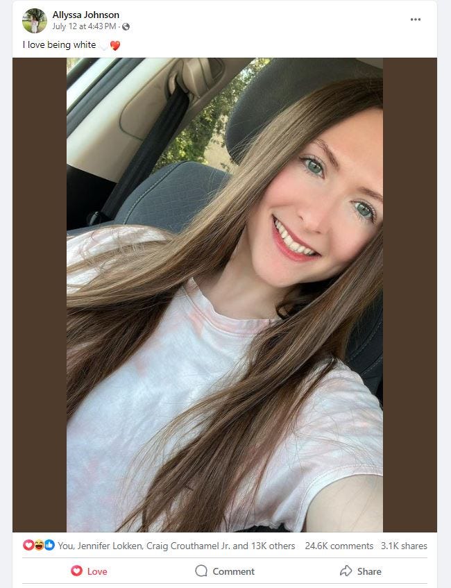 Her crime was daring to say that… she loves being white.