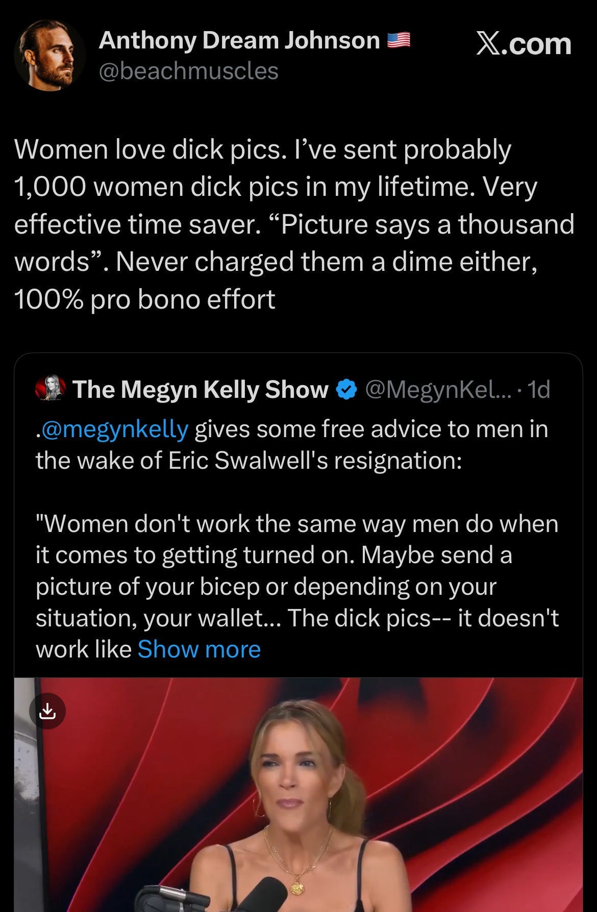 Let’s stay on topic with dick pics though, of which I have been an advocate for many years. In fact this very newsletter was banned from Aweber in April of 2024 for publishing a free advice video about sending women dick pics, while wearing a Make Women Breed Again hat.