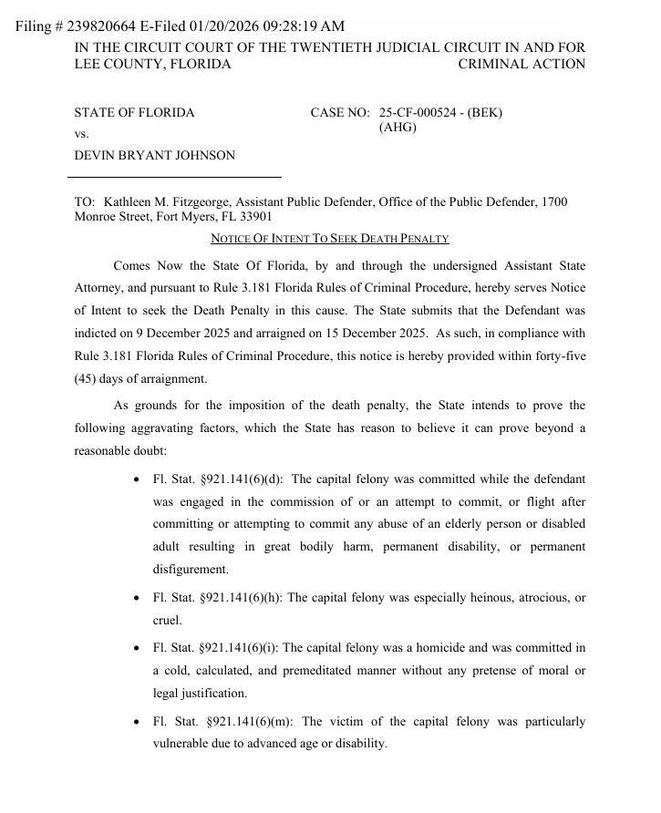 At face value - without knowing anything else - it’s reasonable to seek the death penalty. Especially if Devin Johnson was a random criminal who broke into my mom’s house, and then killed her in this fashion.